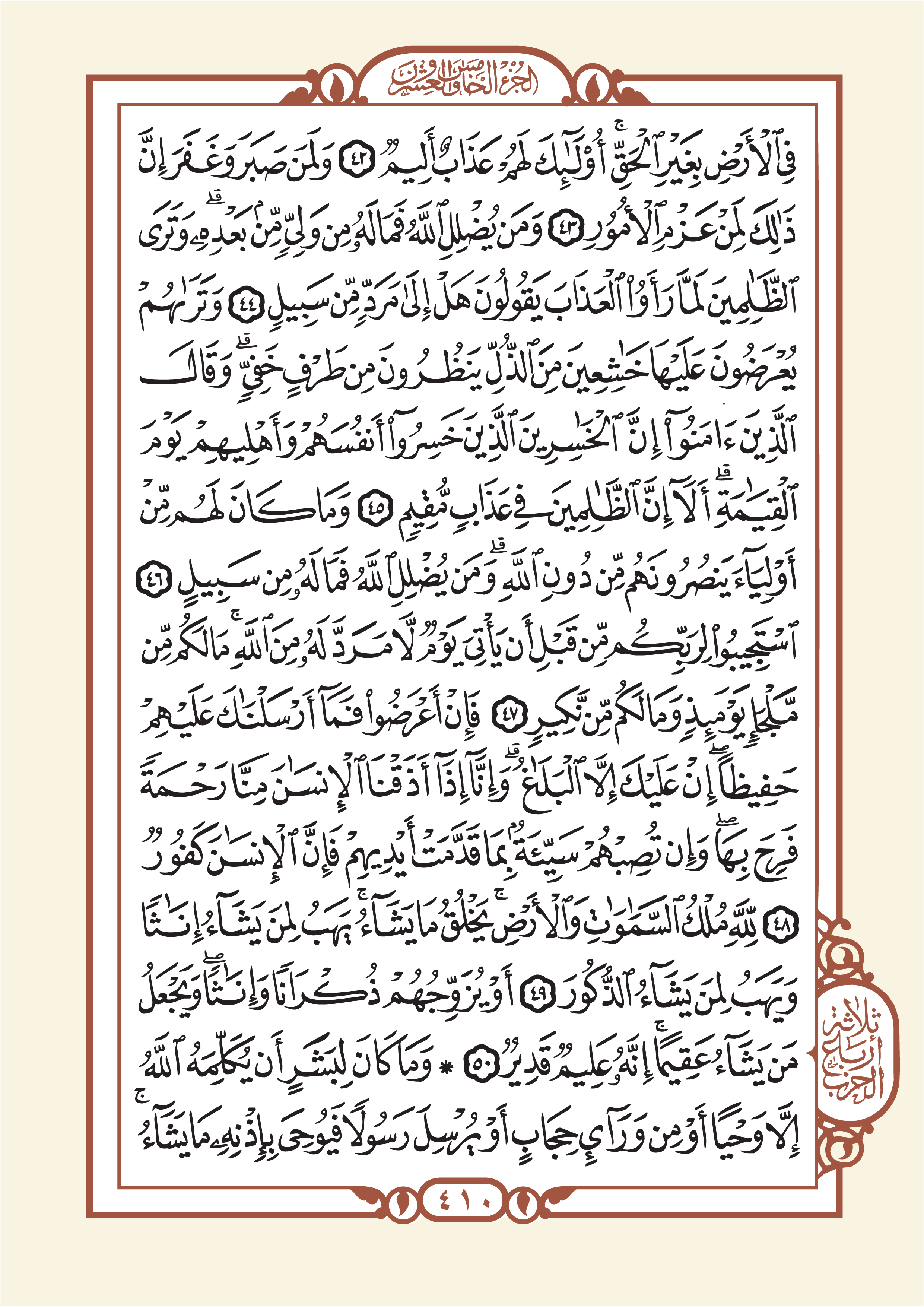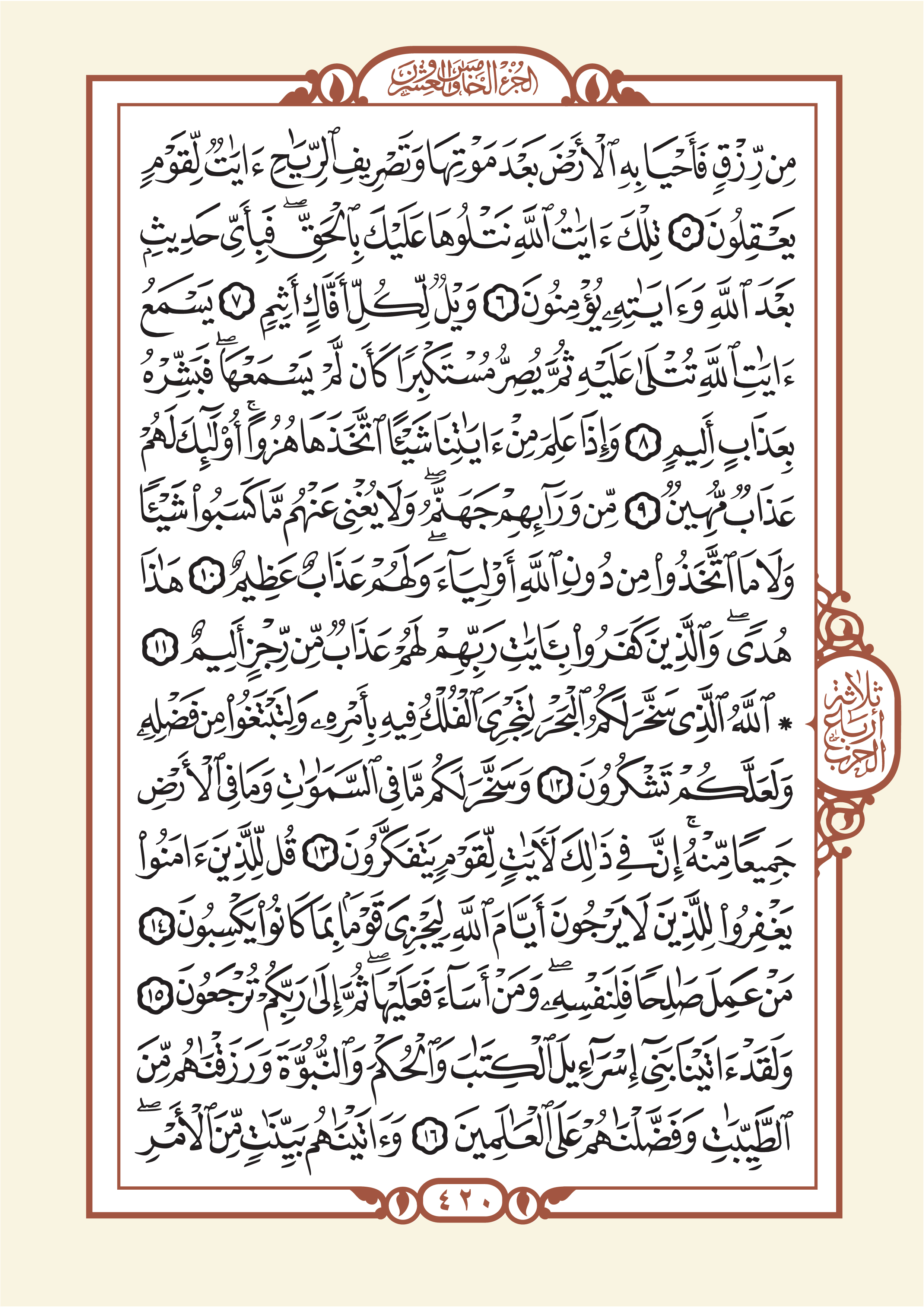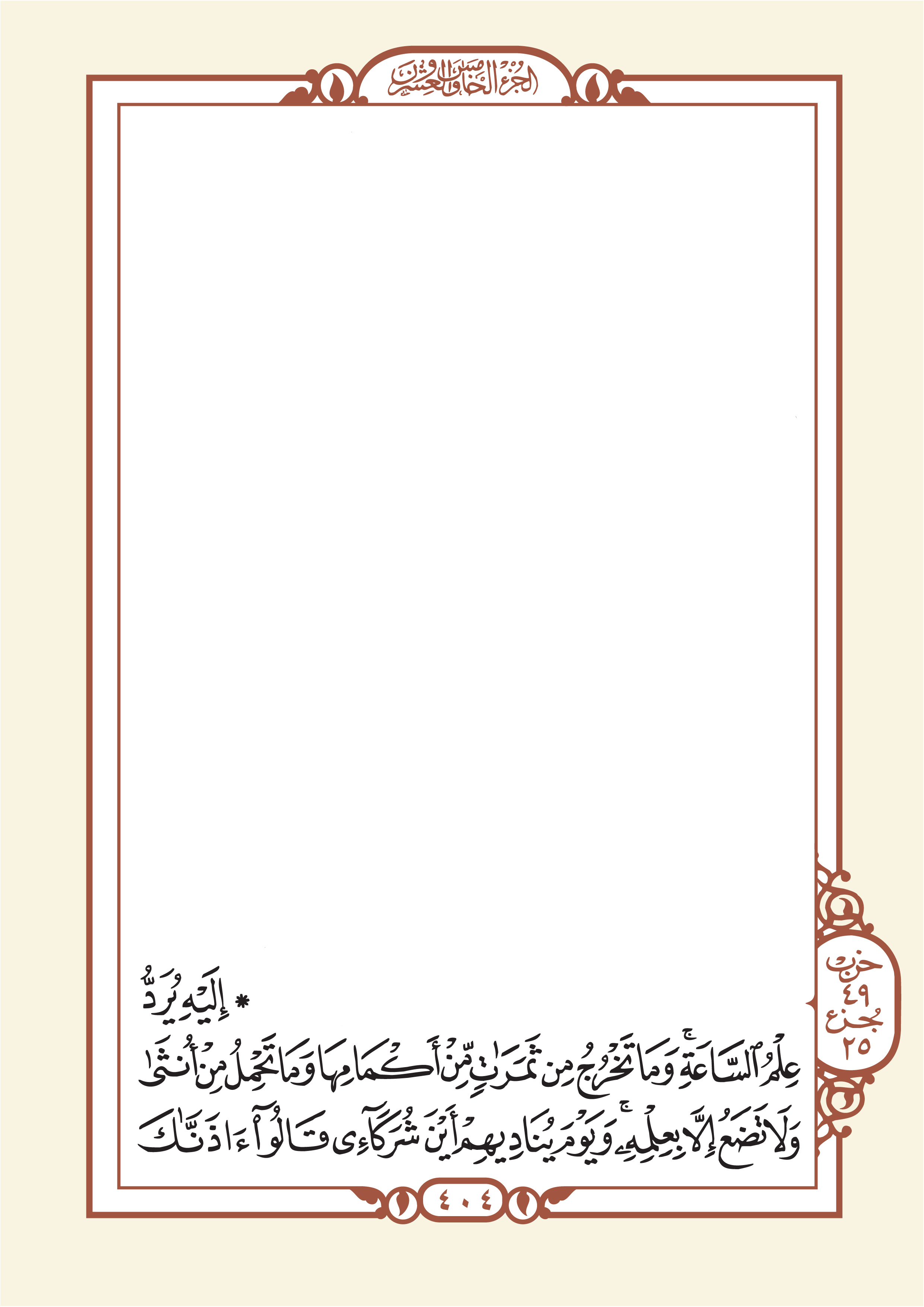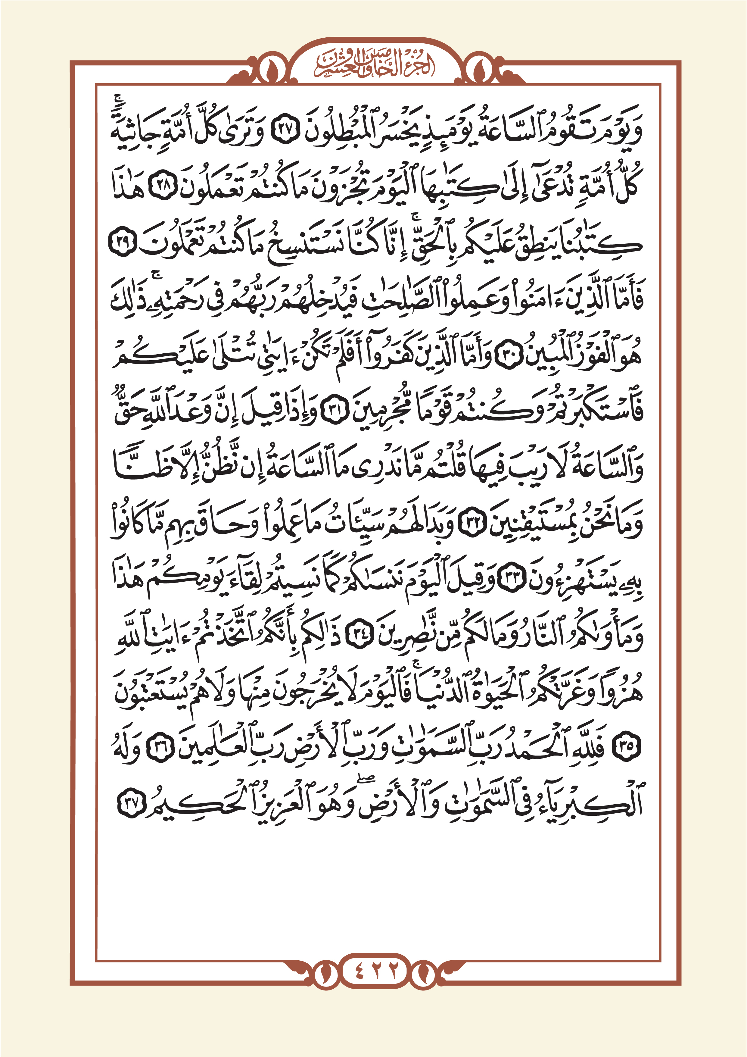الجزء الخامس والعشرون: عبارة عن تكملة لسورة فصلت آية 47 وينتهي بآية 37 من سورة الجاثية.